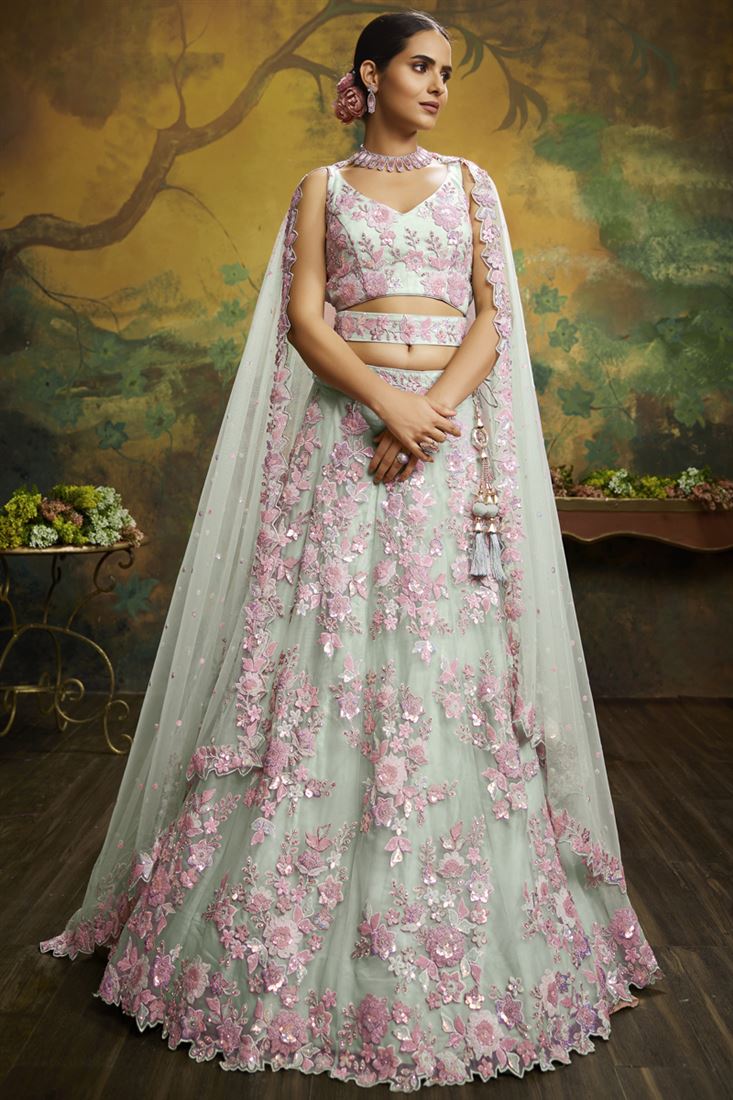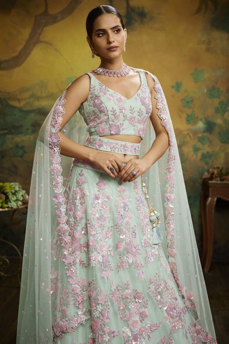 Sea Green Color Embroidered Work On Net Fabric Beatific Wedding Wear Lehenga Choli