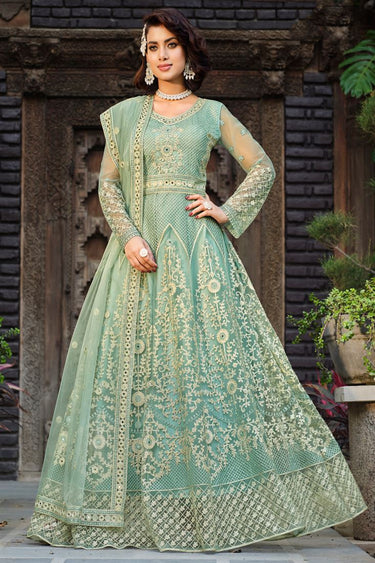 Sea Green Color Net Fabric Attractive Embroidered Anarkali Suit