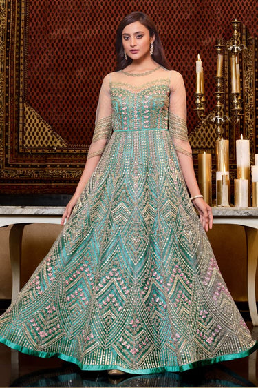 Sea Green Color Net Fabric Tempting Function Wear Anarkali Suit