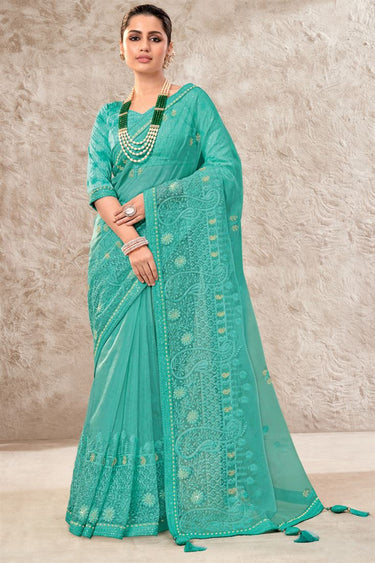 Sea Green Color Party Style Organza Fabric Charismatic Saree