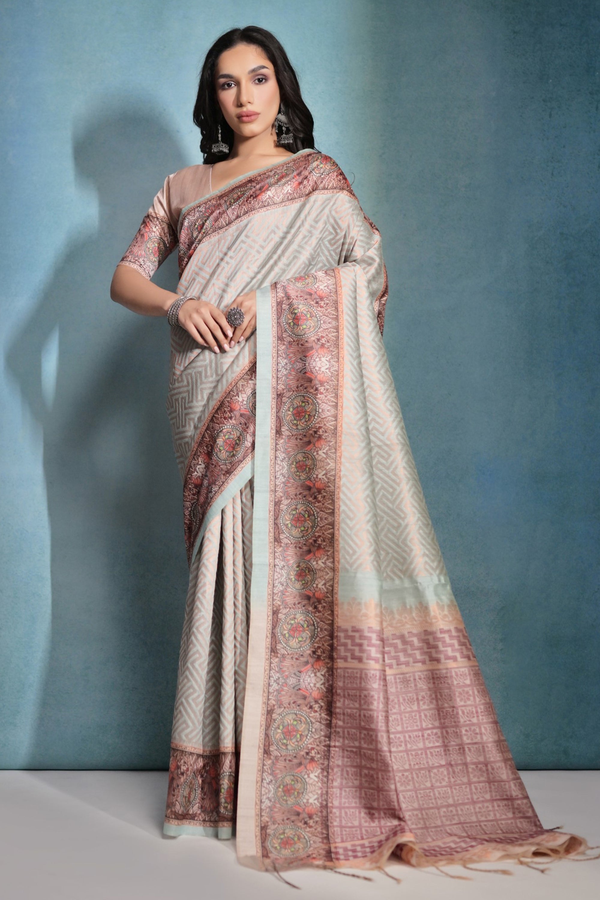 Sea Green Color Printed Border Work Function Wear Cotton Silk Fabric Saree