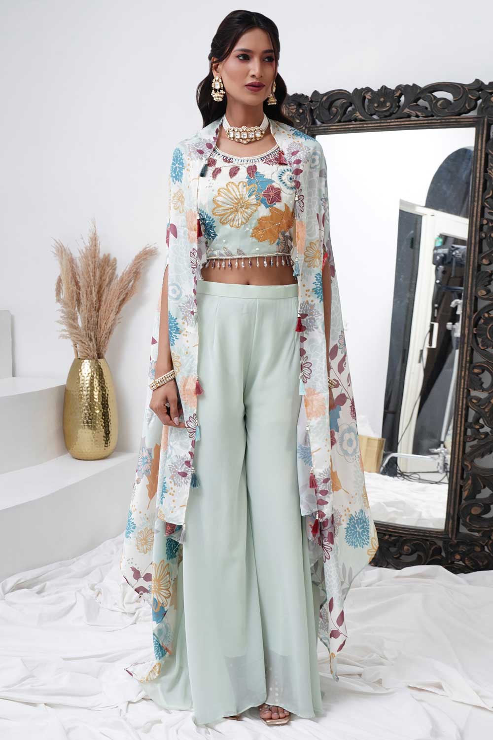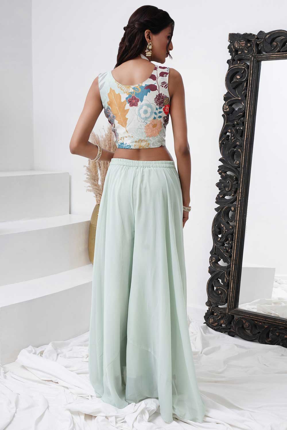 Sea Green Digital Chinon Handwork Top with Palazzo & Shrug