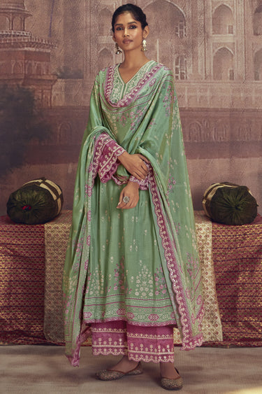 Sea Green Embroidered Palazzo Suit In Muslin Fabric