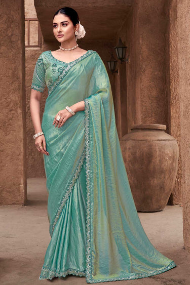 Sea Green Gradient Satin Silk Artisanal Hand Embroidered Work Saree