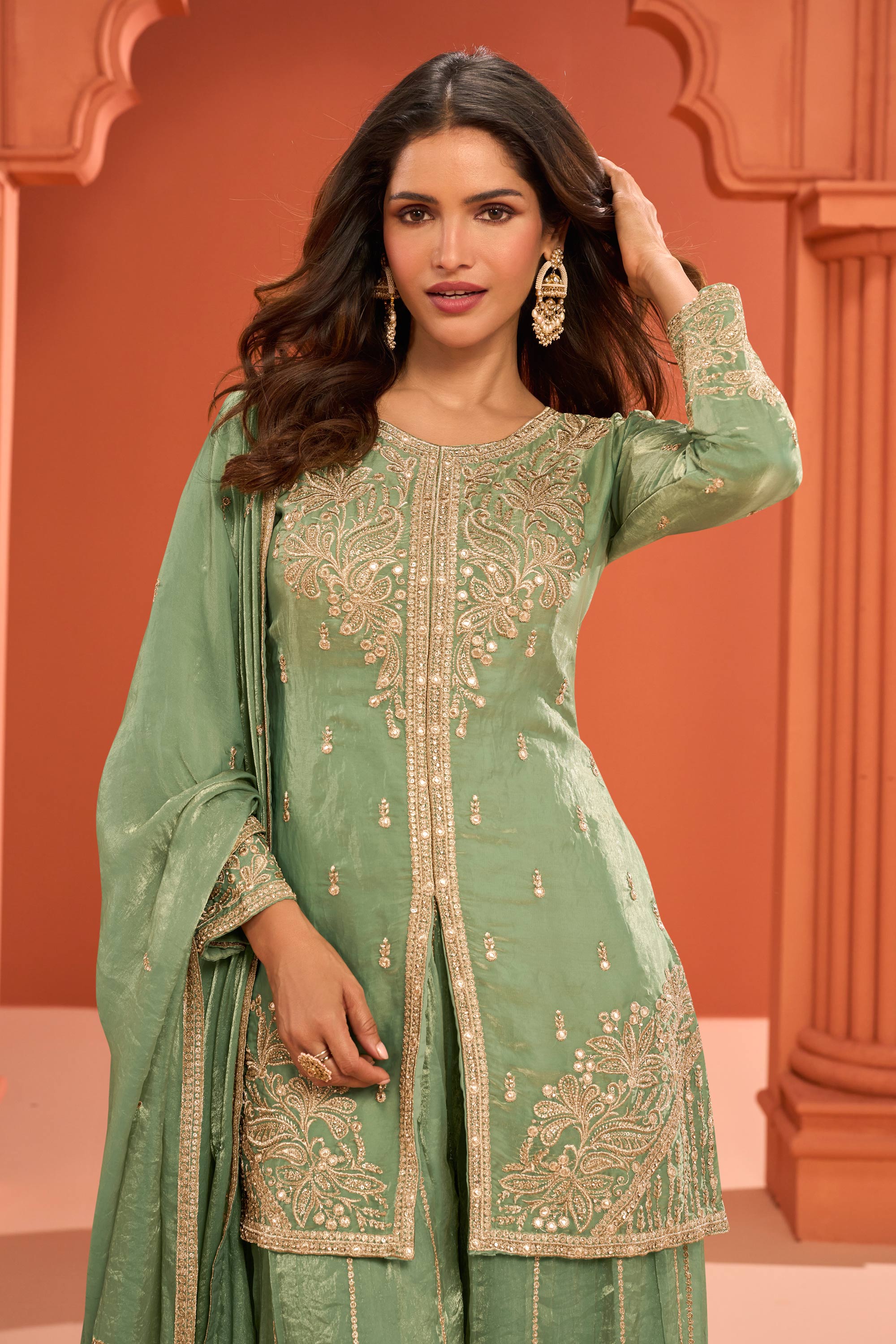 Sea Green Sangeet Wear Art Silk Embroidered Readymade Palazzo Suit
