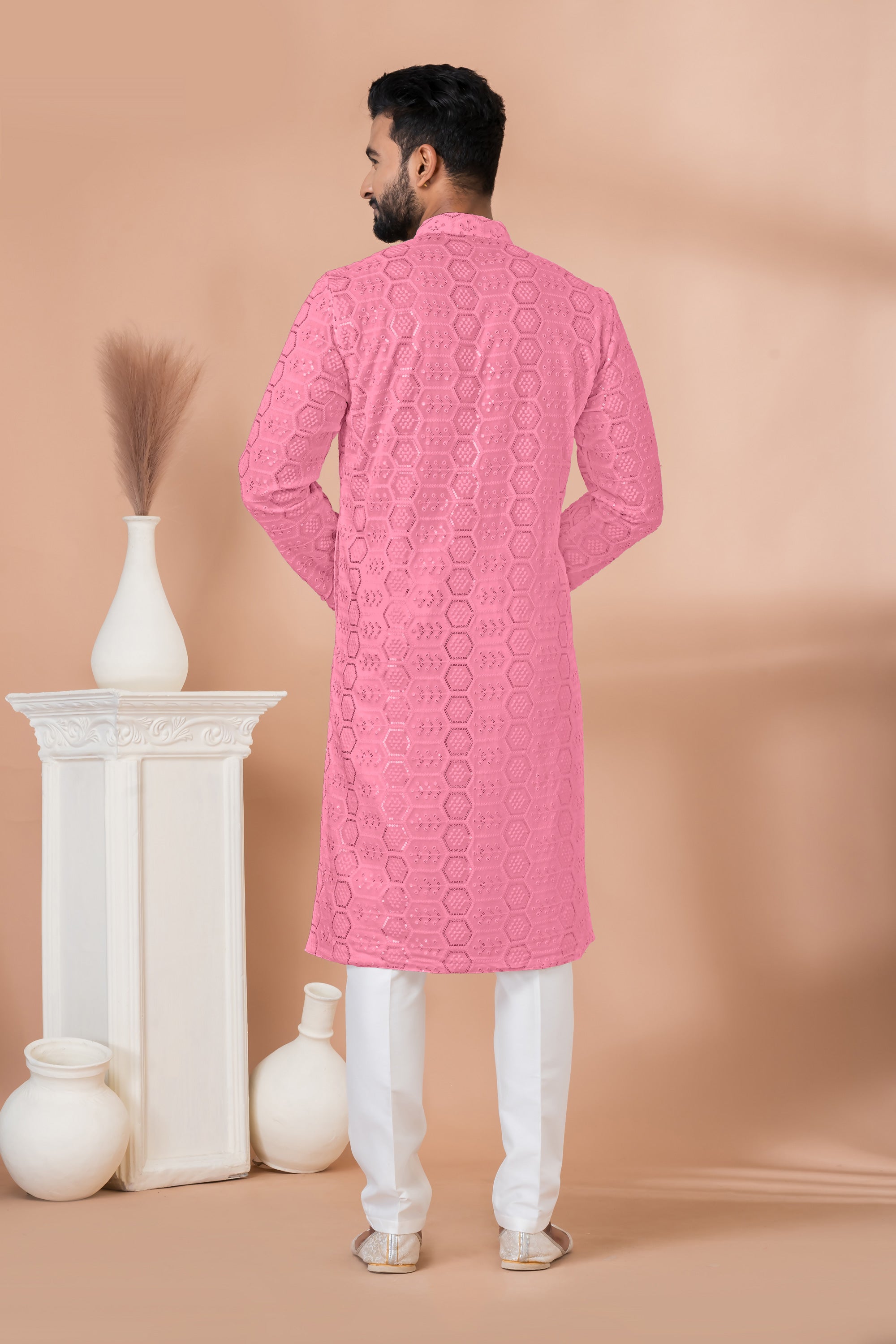 Sequins Embroidery Pink Georgette Graceful Readymade Men Kurta Pyjama For Festive Wear