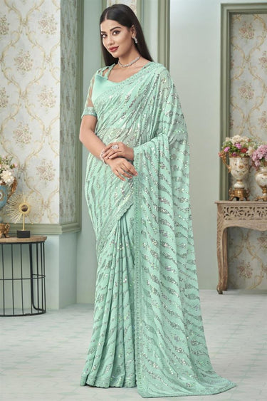 Sequins Work Georgette Fabric Sea Green Color Wonderful Saree