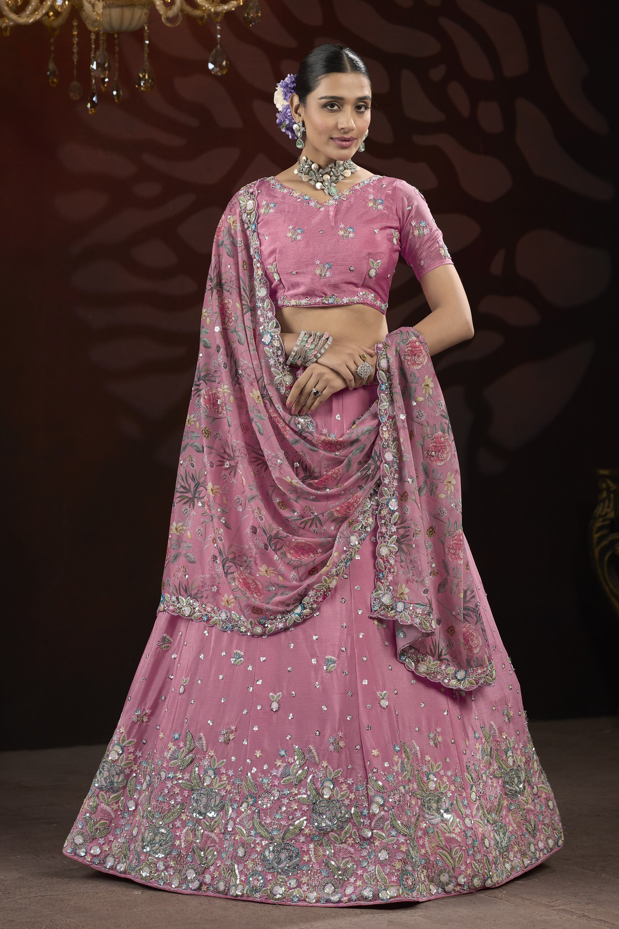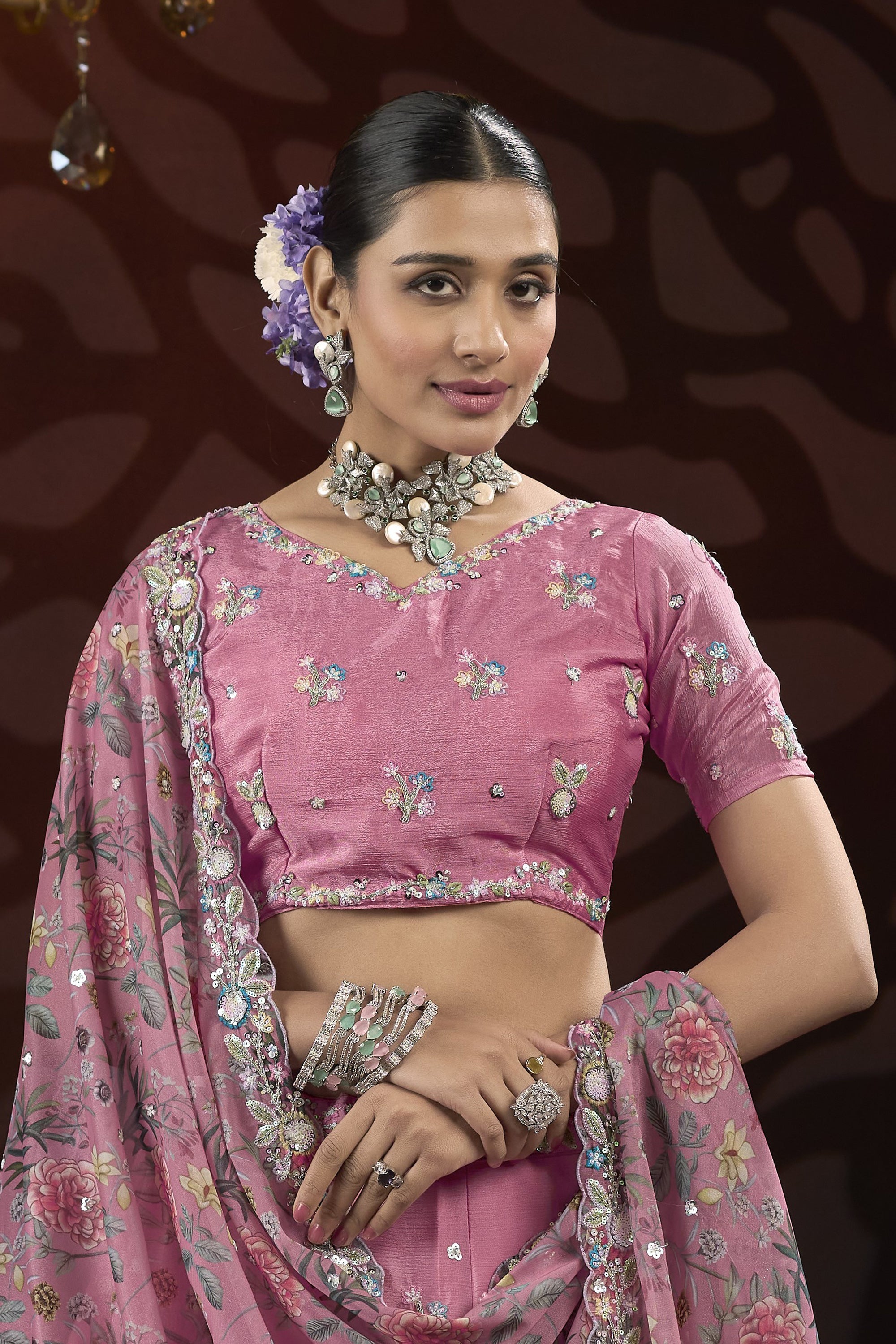 Sequins Work Sangeet Wear Lehenga In Pink Chinon Fabric With Blouse