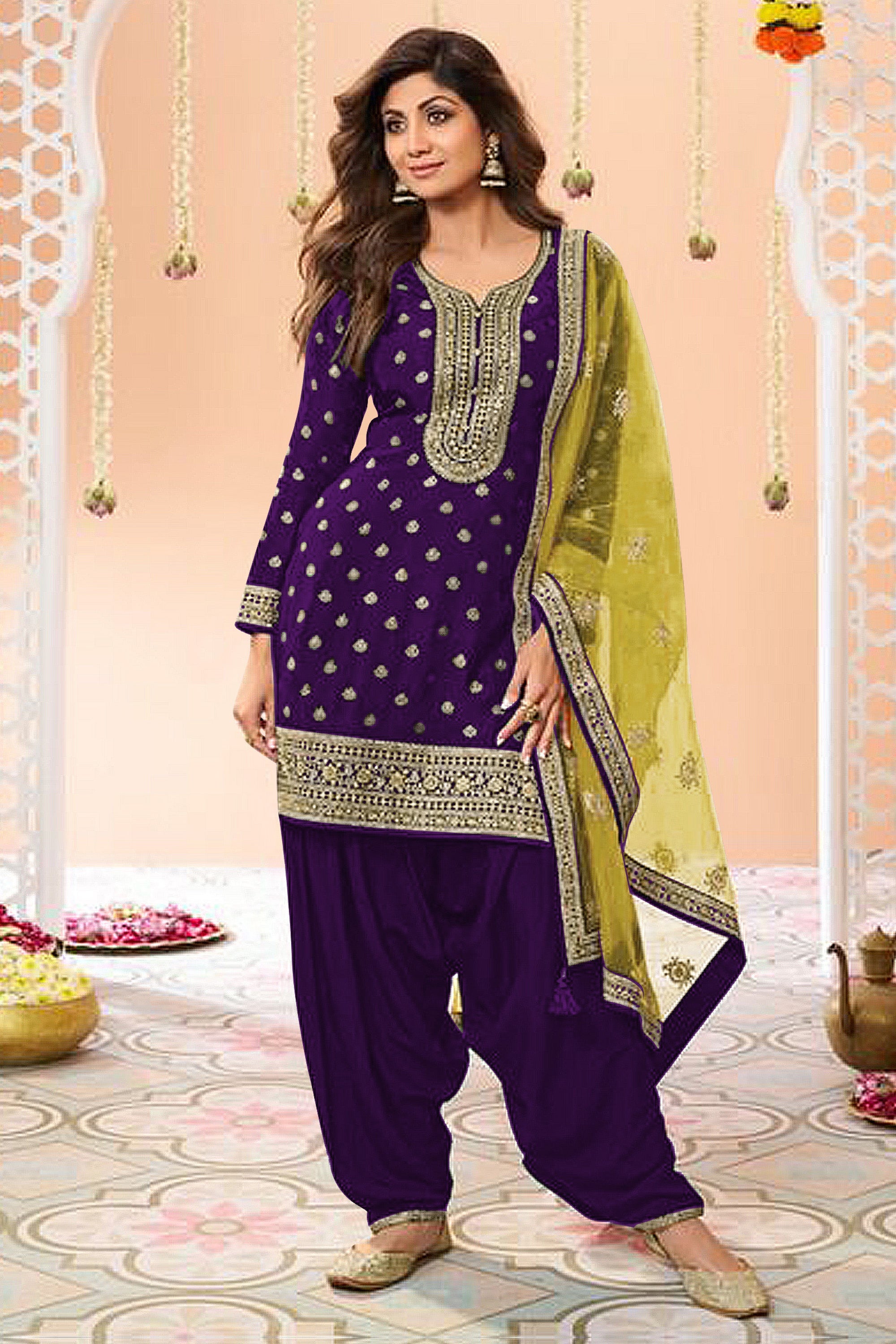 Shilpa Shetty Purple Jacquard Silk Embroidered Patiala Suit