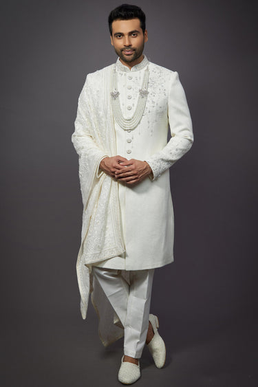 Silk Fabric Designer Wedding Wear Readymade Groom Sherwani For Men In White Color