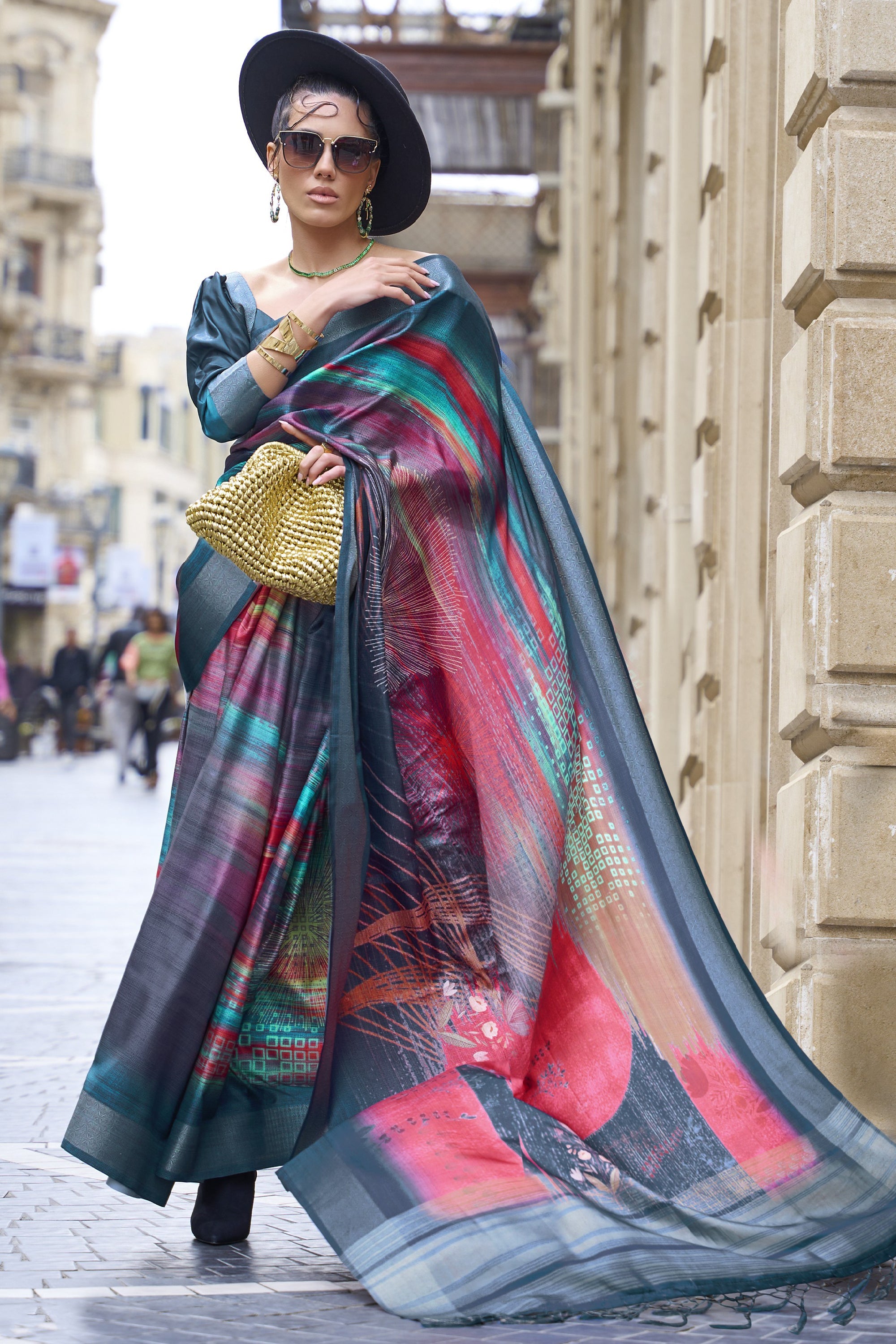 Silk Fabric Digital Printed Multi Color Wedding Wear Saree With Designer Blouse