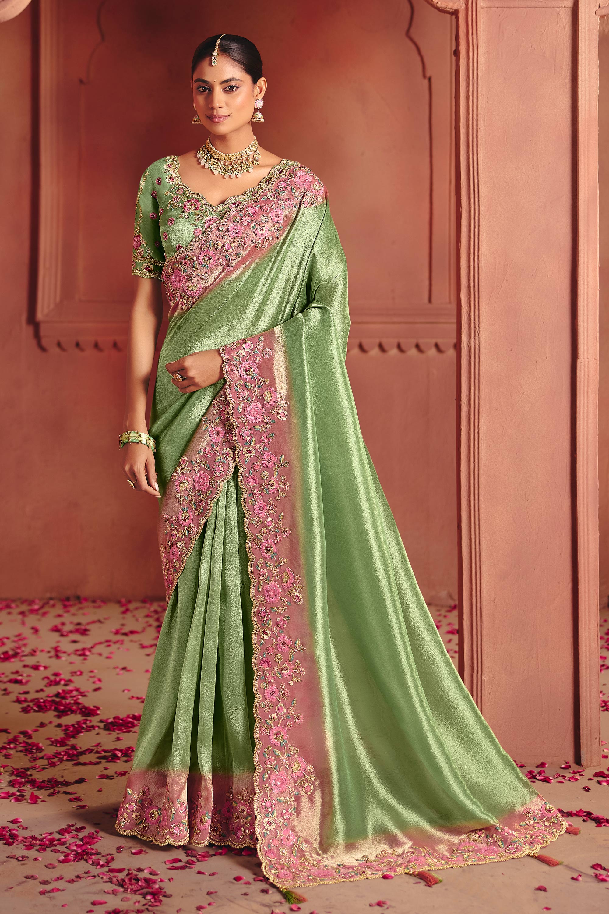 Silk Fabric Embroidered Green Wedding Wear Saree