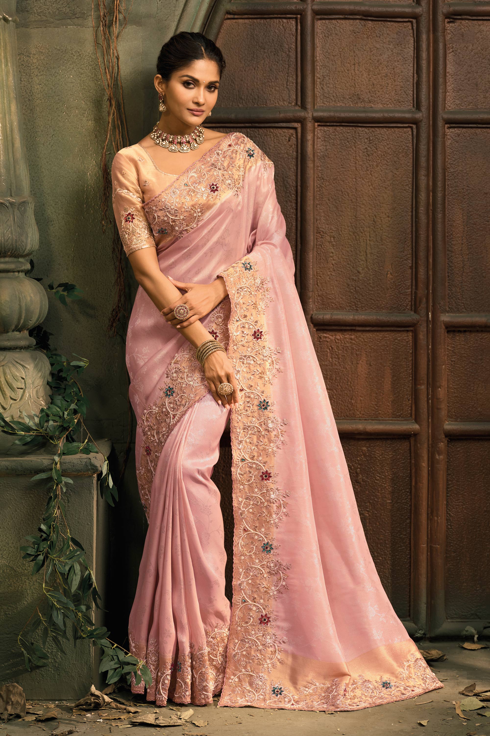 Silk Fabric Pink Embroidered Wedding Wear Saree
