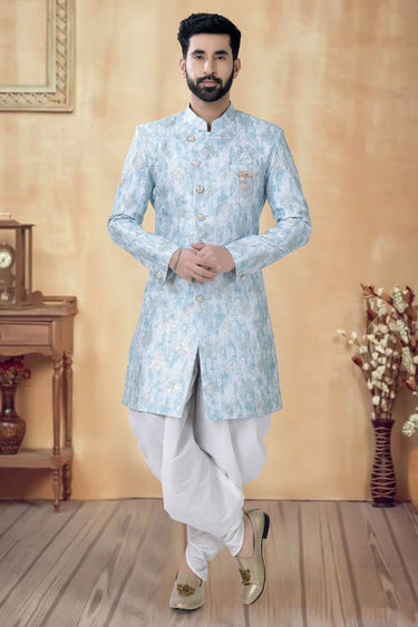 Silk Fabric Sky Blue Color Festive Wear Readymade Stunning Indo Western For Men