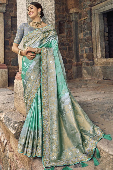 Silk Fabric Weaving Work Cyan Color Wedding Wear Fancy Saree