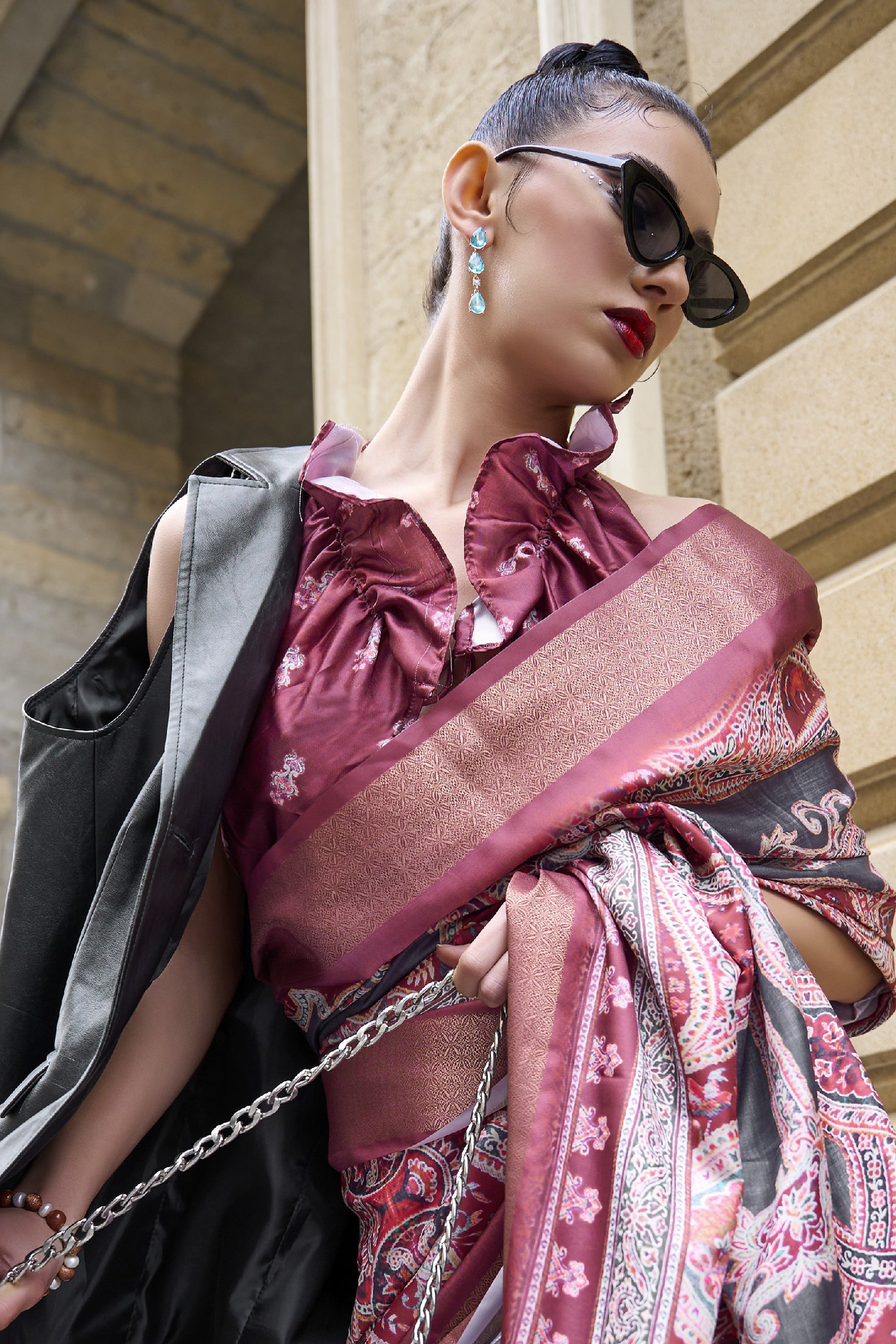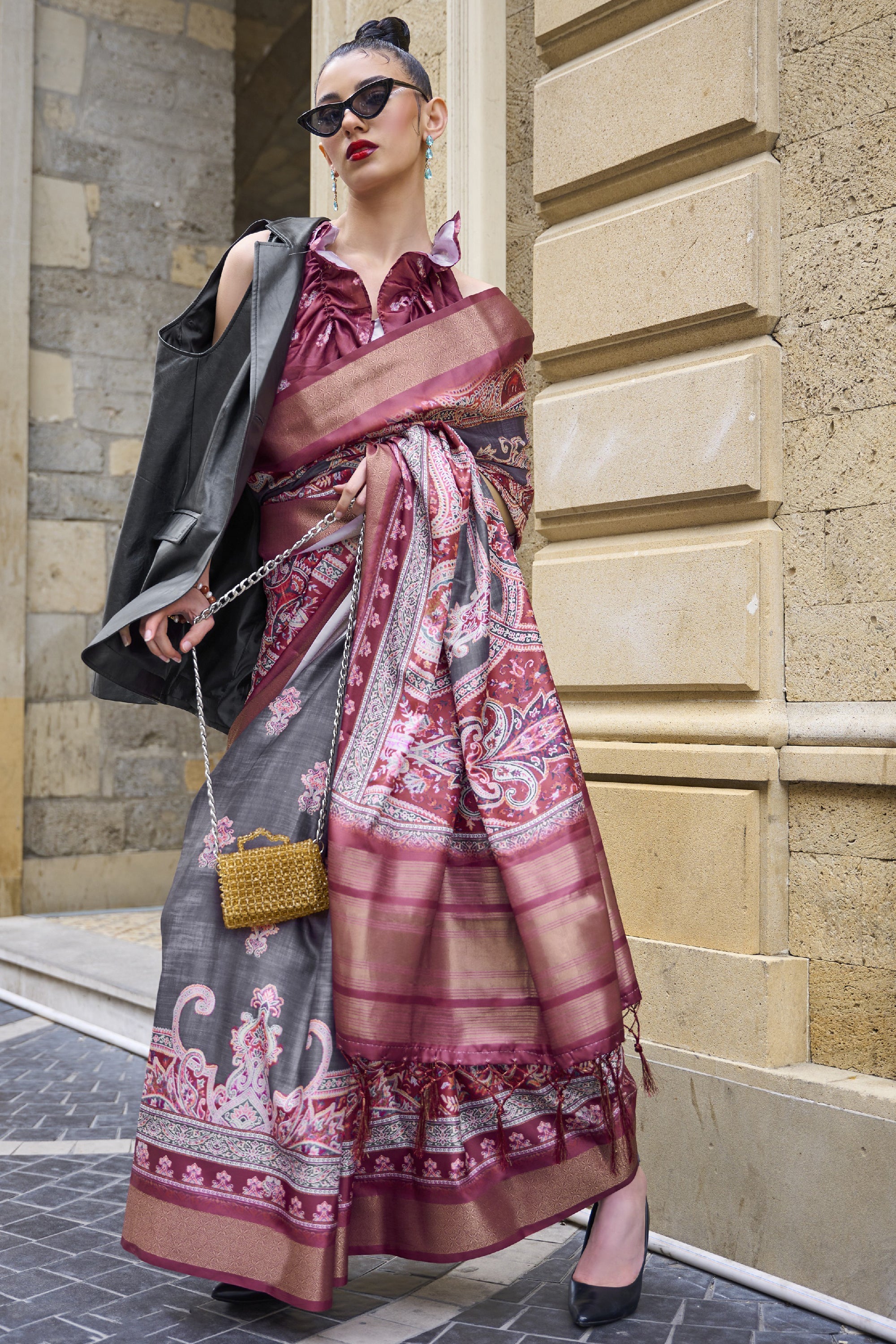 Silk Fabric Wedding Wear Grey Color Fancy Digital Printed Saree With Designer Blouse