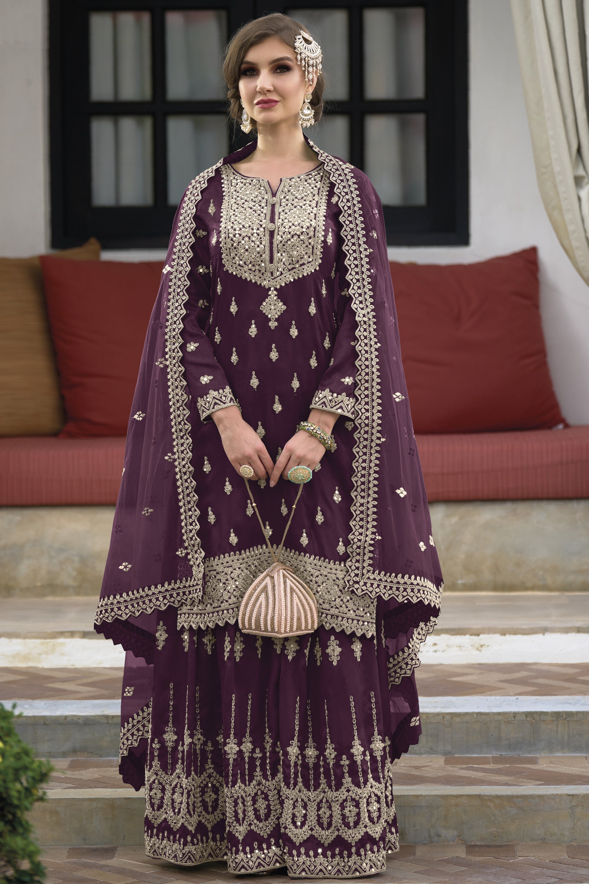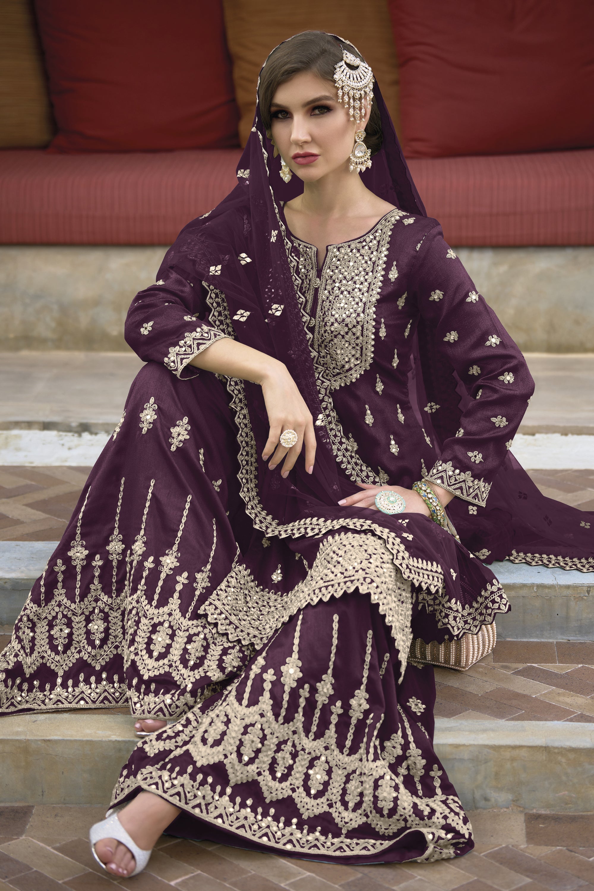 Silk Fabric Wine Color Festive Wear Embroidered Readymade Designer Sharara Style Salwar Kameez