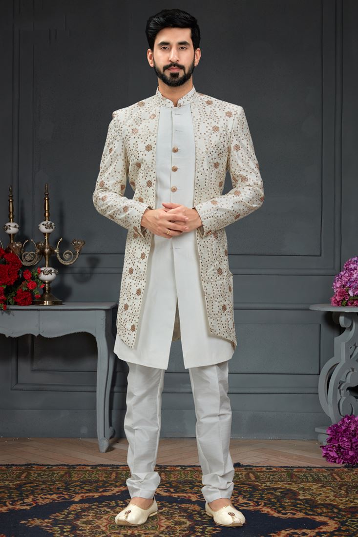 Silk Stunning Off White Color Wedding Wear Readymade Men Indo Western