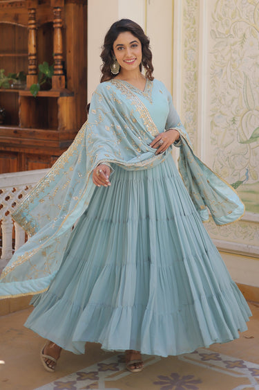 Sky Blue Color Embroidered Readymade Anarkali Style Long Gown With Dupatta