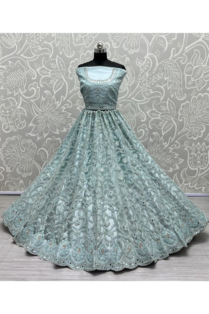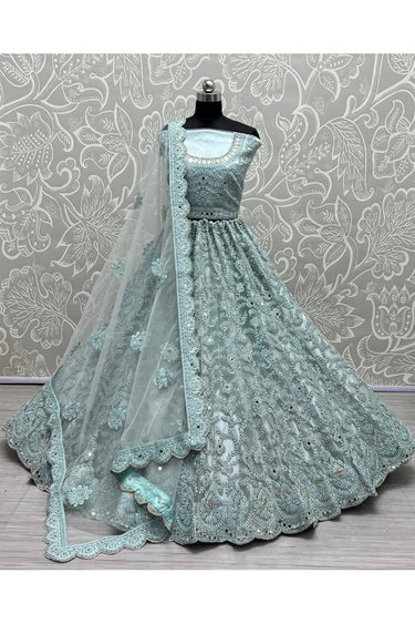 Sky Blue Color Gorgeous Embroidered Designs Net Bridal Lehenga