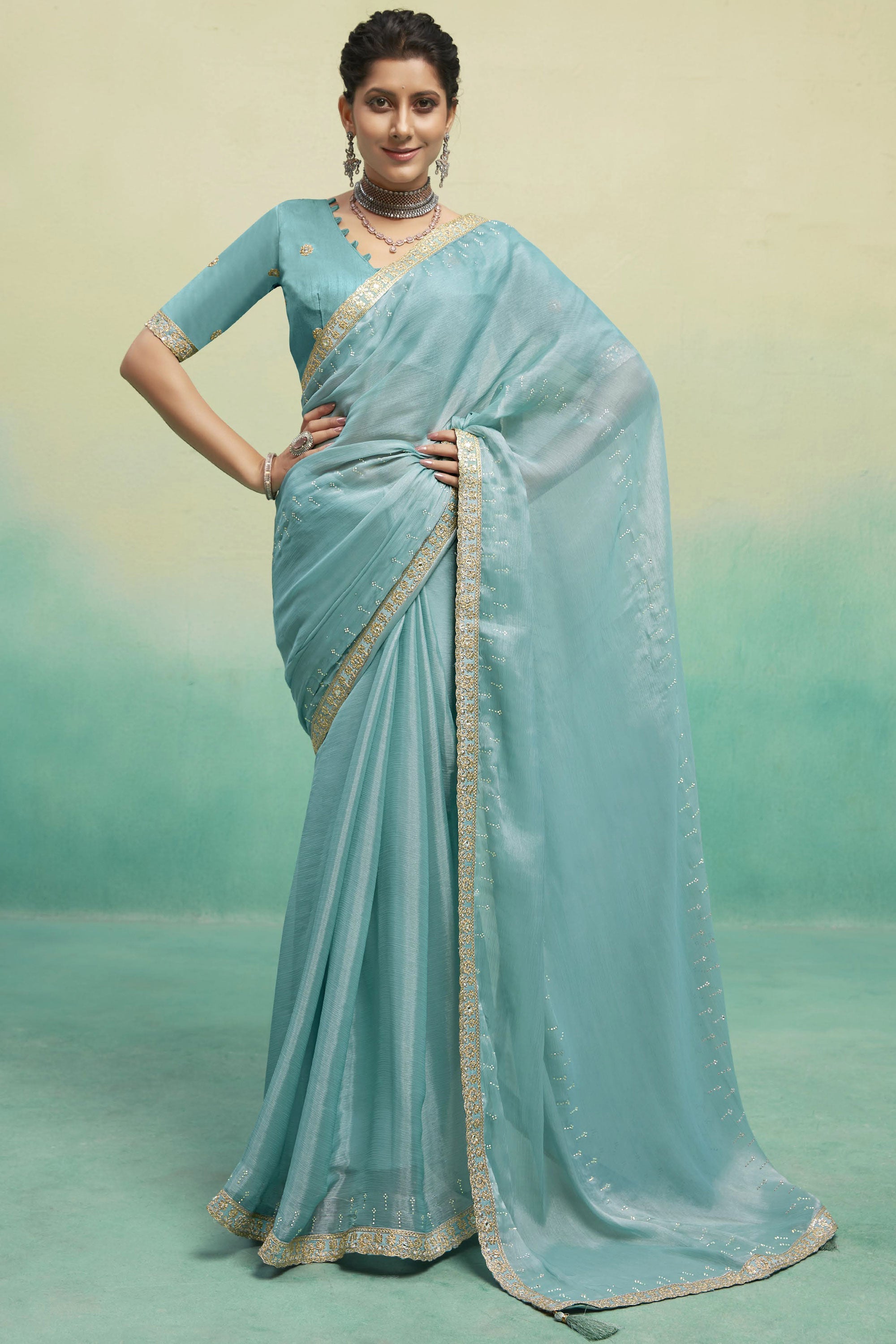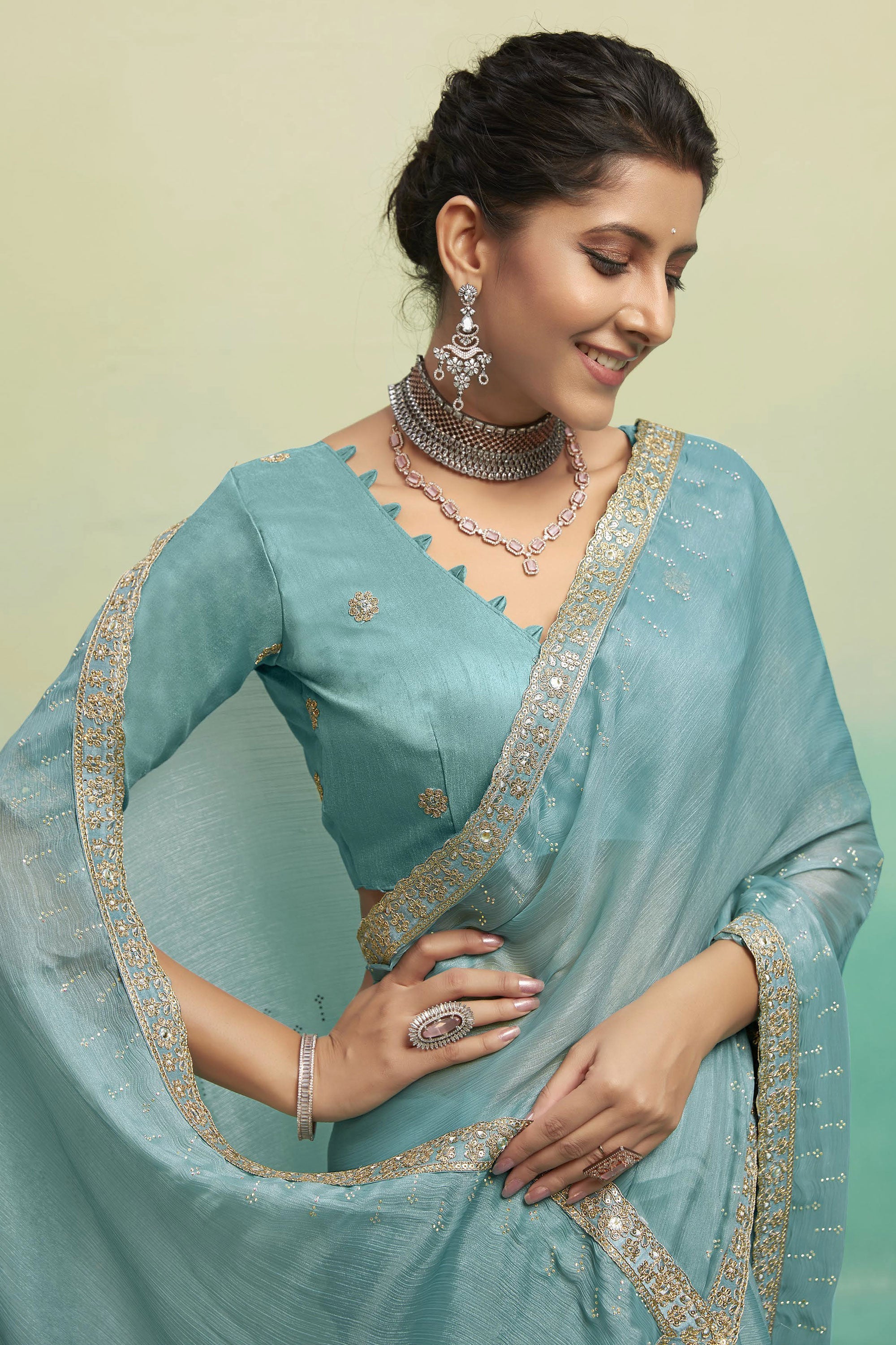 Sky Blue Color Lace Border Work Chiffon Fabric Saree With Embroidered Blouse