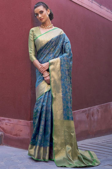 Sky Blue Color Puja Wear Patola Art Silk Fabric Trendy Weaving Work Saree