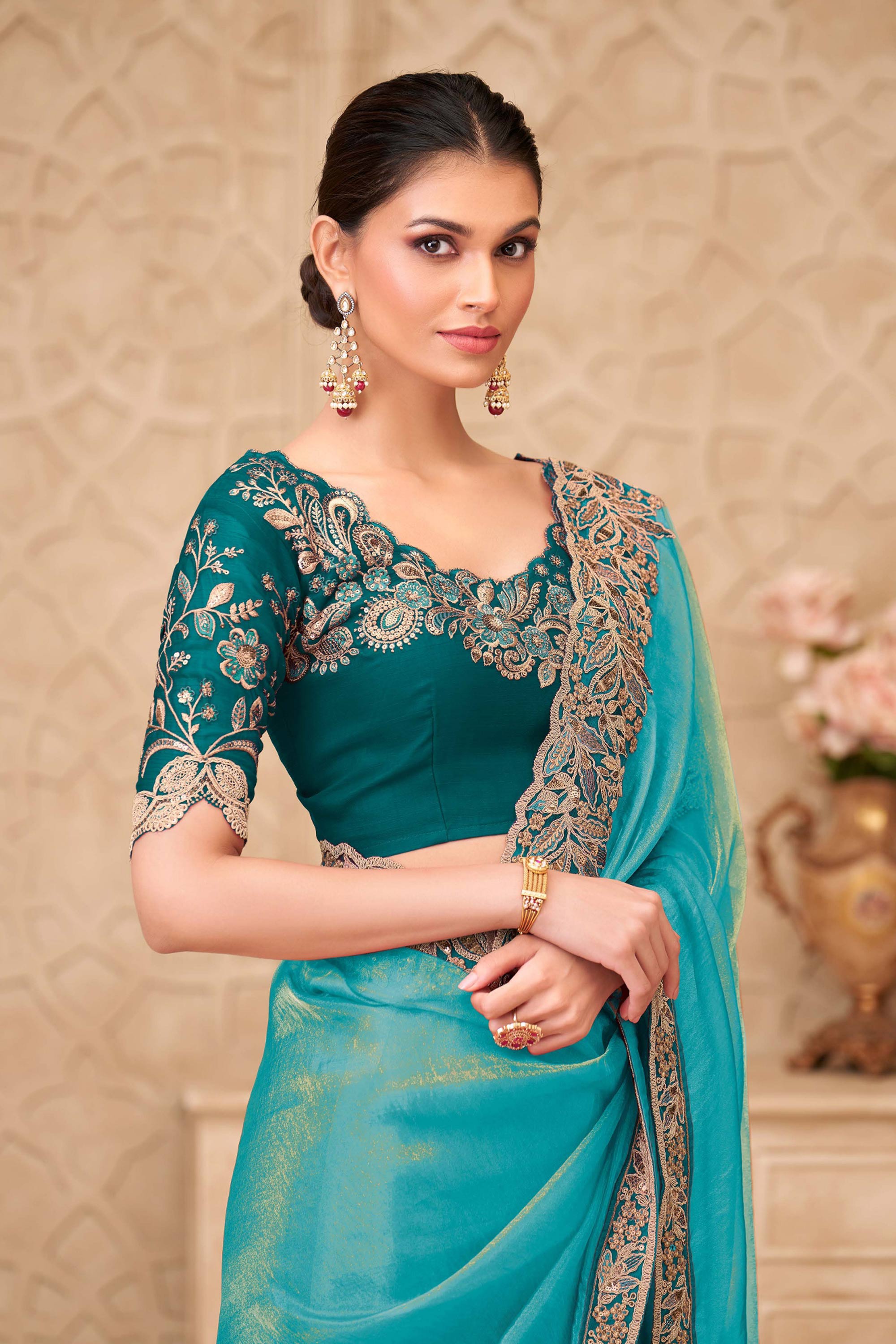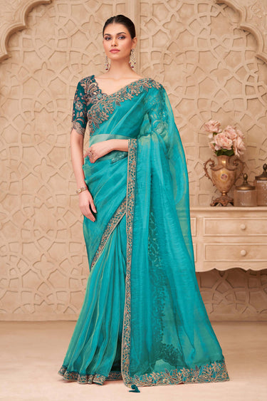 Sky Blue Embroidered Georgette Silk Party Wear Saree