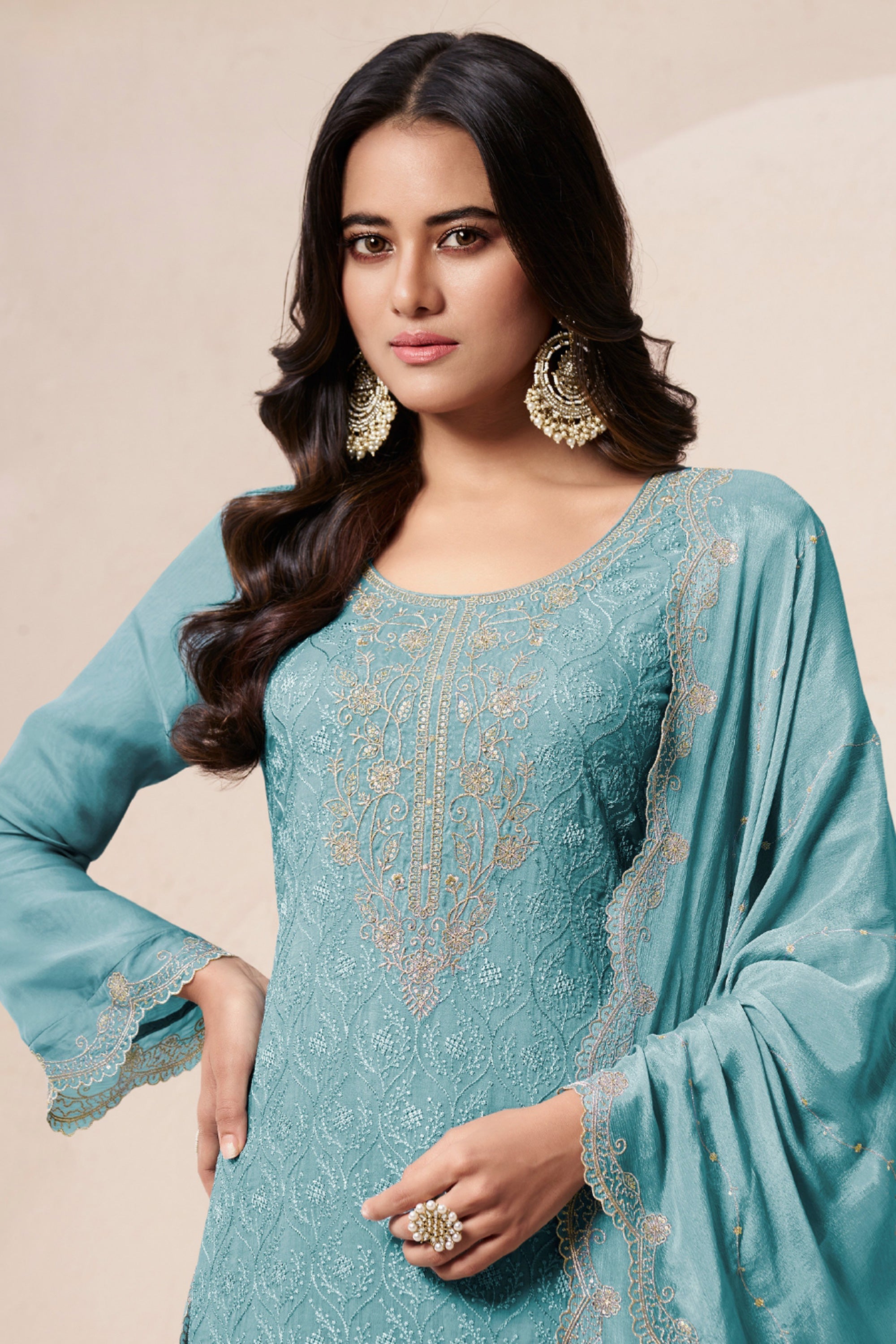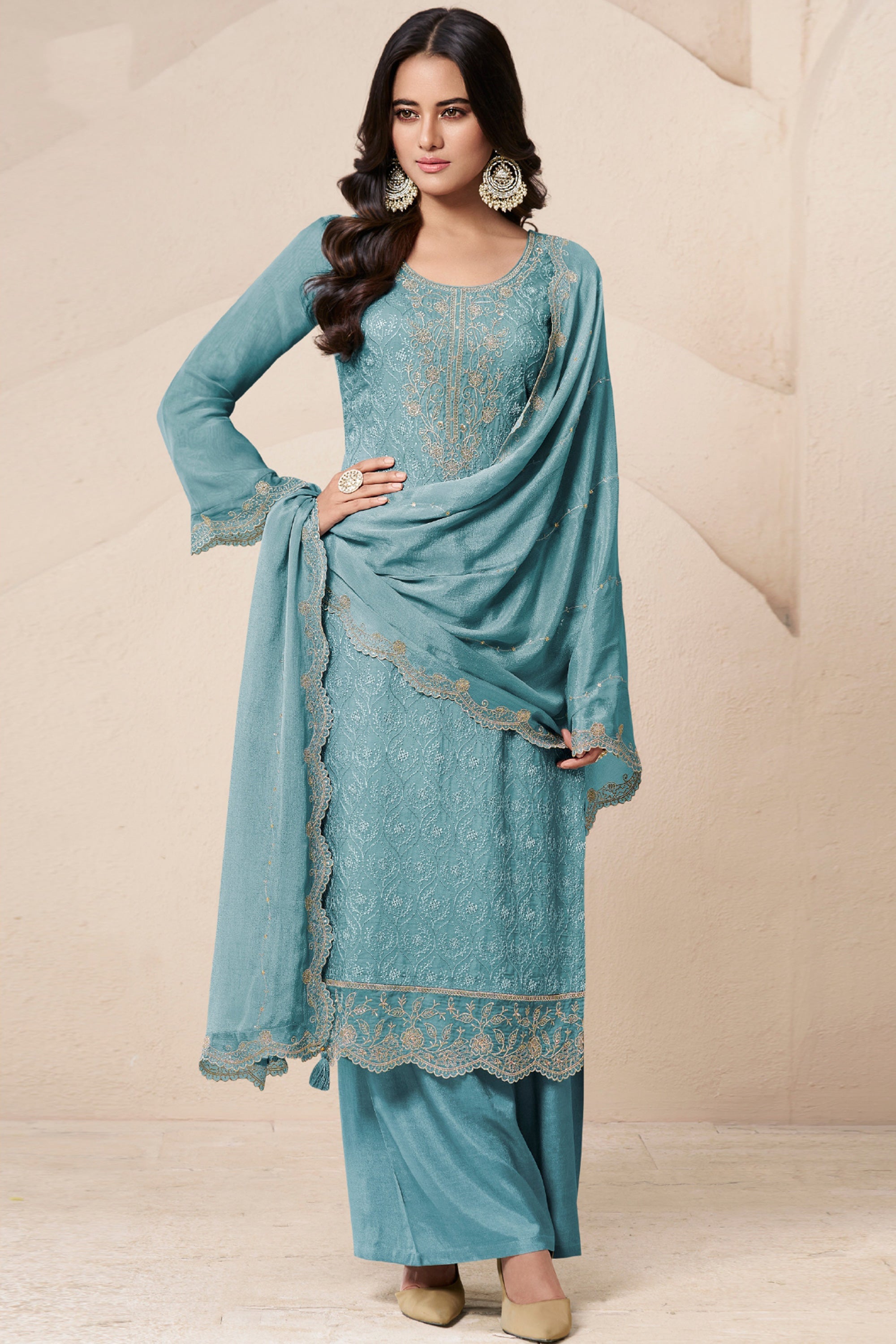 Sky Blue Organza Embroidered Palazzo Suit For Function Wear