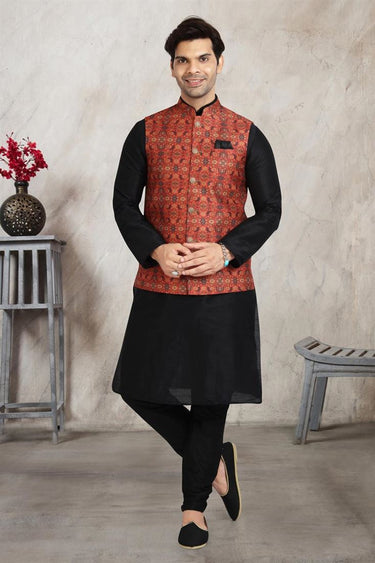 Sober Black Color Banarasi Silk Fabric Kurta Pyjama With Black Jacket