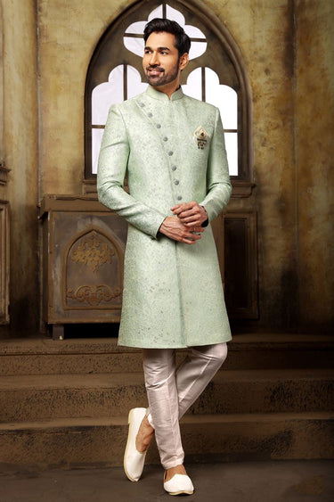 Sober Brocade Fabric Indo Western In Sea Green Color