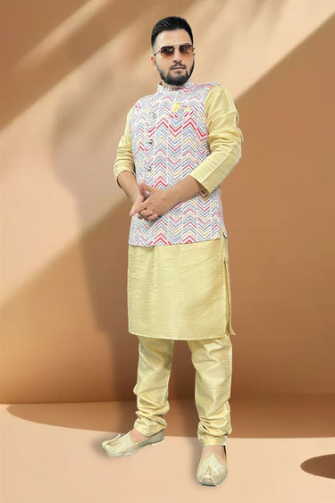 Sober Silk Fabric Function Wear Cream Kurta Pyjama With Grey Color Jacket