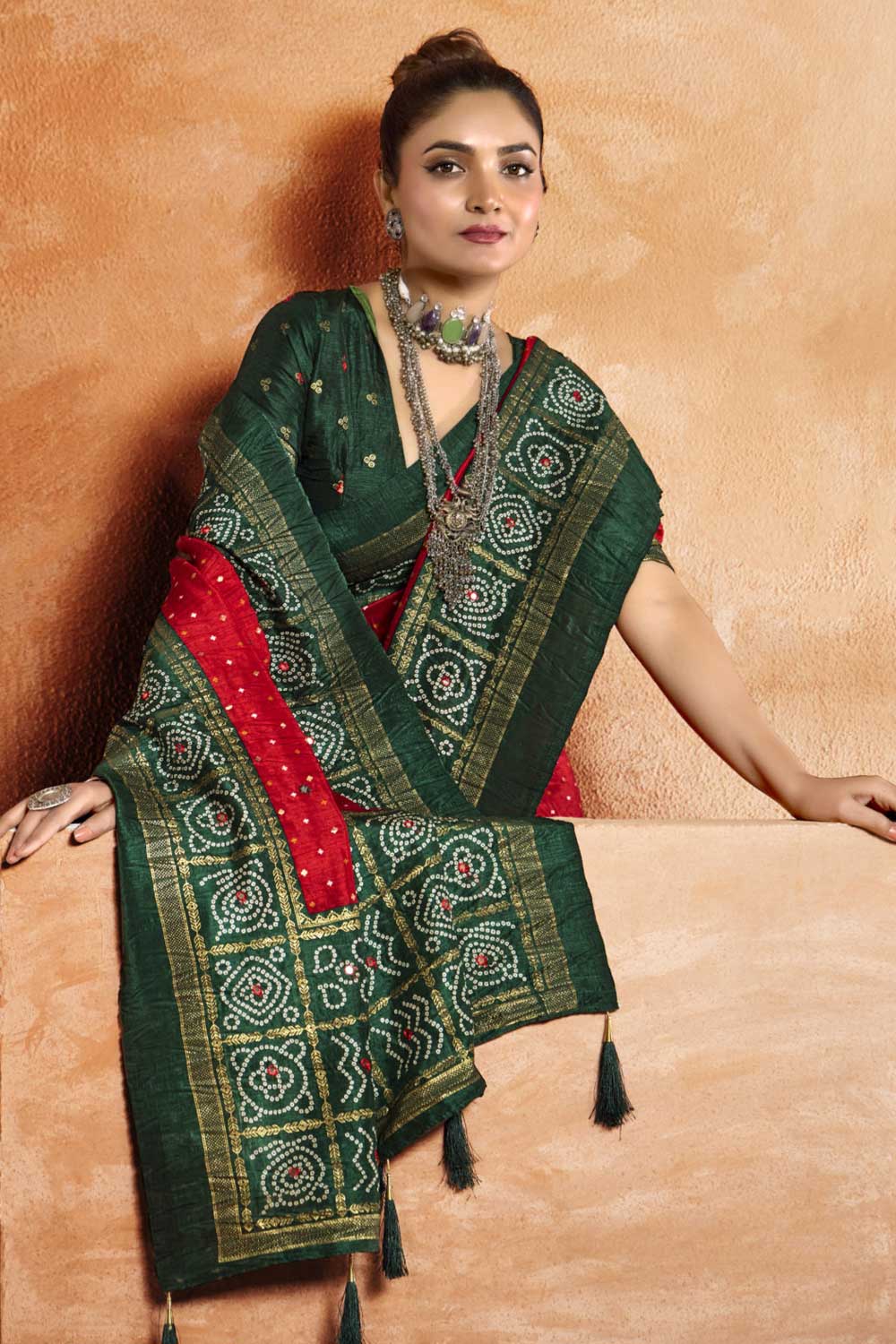 Drape yourself in timeless elegance with this traditional saree crafted from luxurious Real Chinon fabric. The saree and blouse share a harmonious blend of comfort and beauty, adorned with Single Dot Bandhani printed work that embodies heritage with a contemporary twist. Fabric: Real Chinon (Saree & Blouse) Work: Single Dot Bandhani Printed Occasion: Perfect for function wear – be it festive gatherings or traditional celebrations. Pair it with statement jukes and a sleek bun to complete the classic look. Due to digital photography, slight color variations may occur.