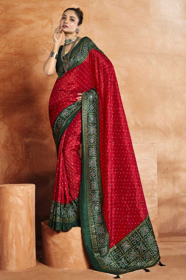 Solid Satin Fabric Single Dot Bandhani Printed Saree In Red Color