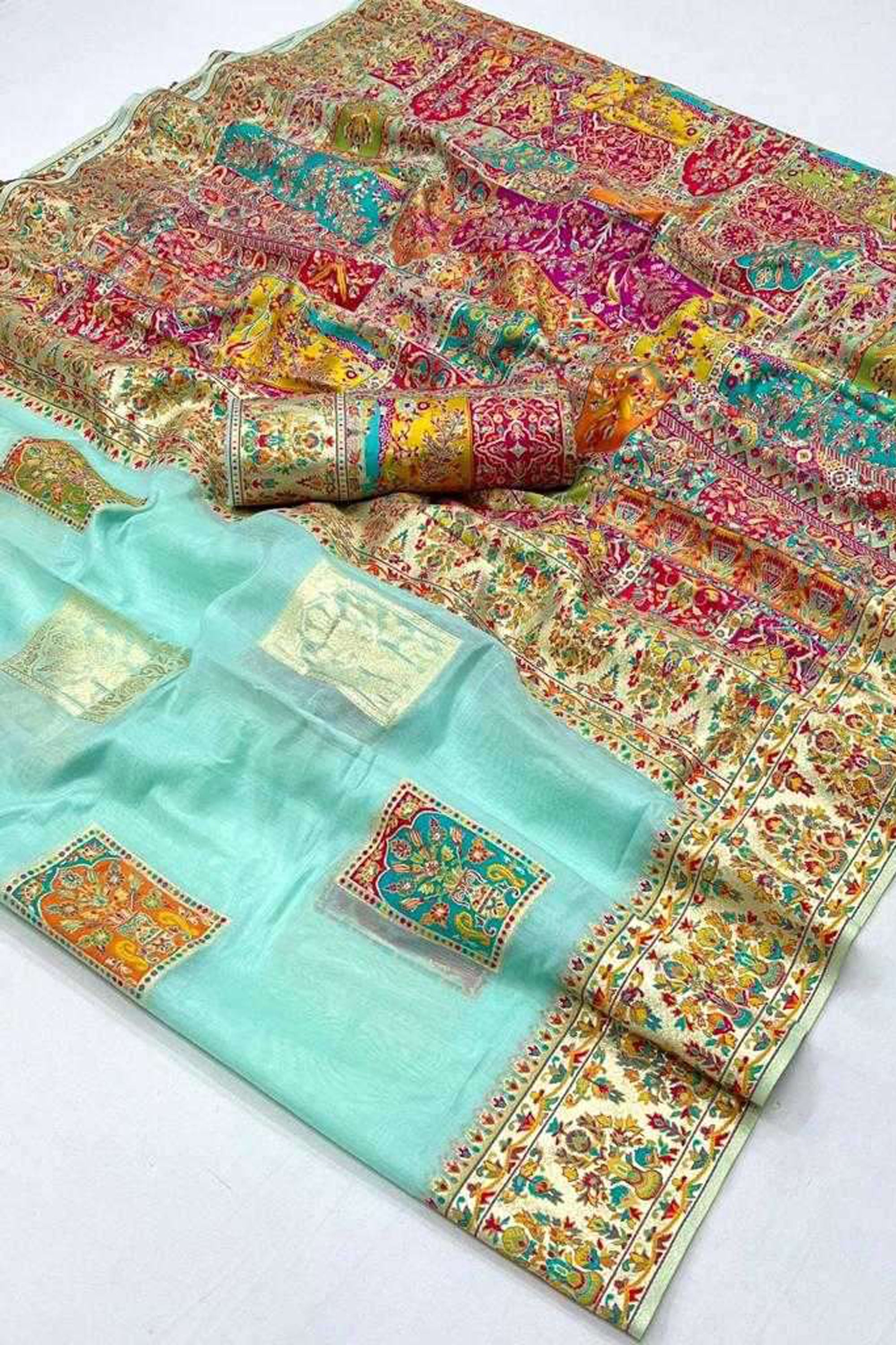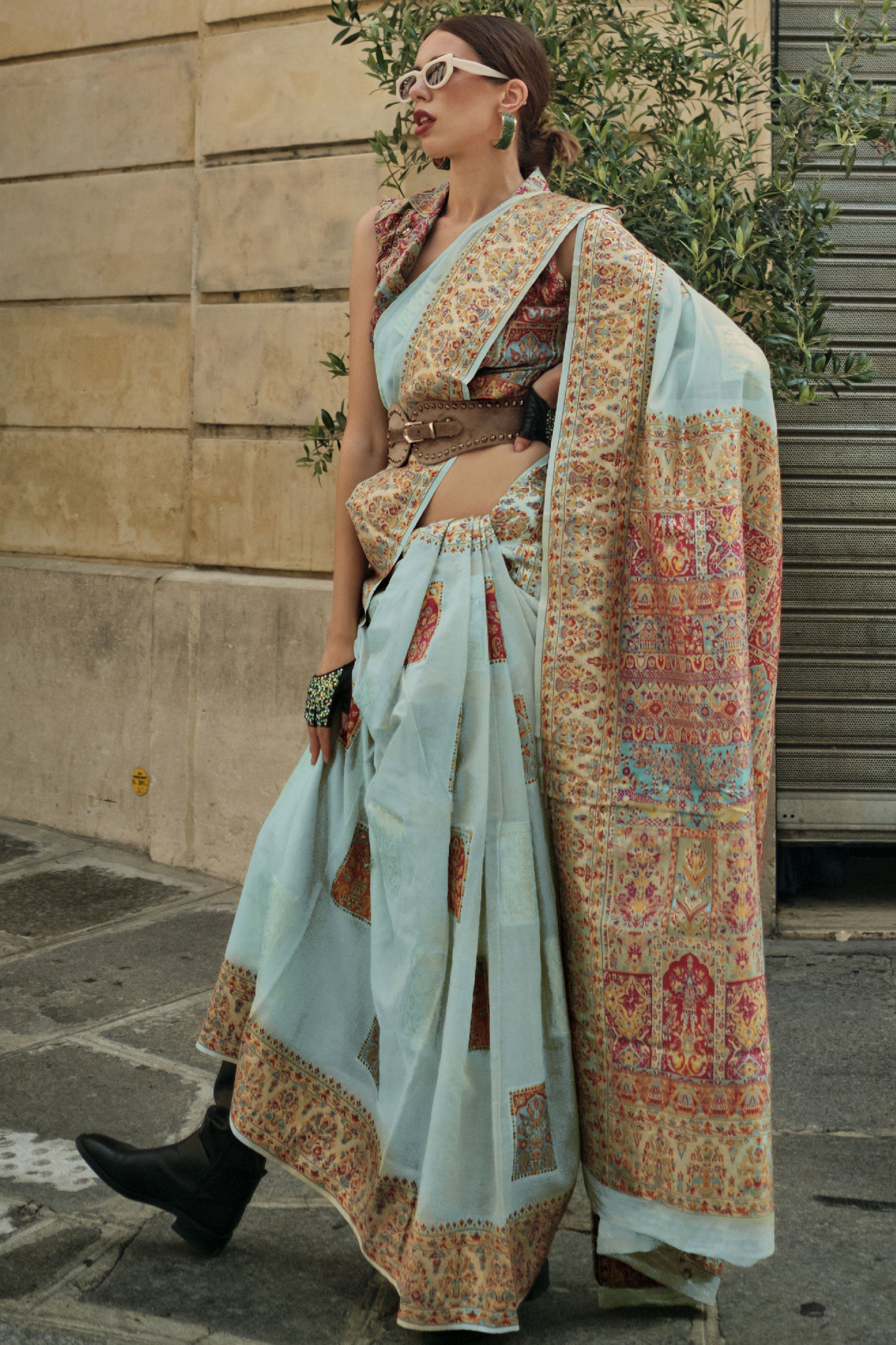 Soothing Light Cyan Color Kashmiri Modal Handloom Weaving Silk Saree With Kashmiri Blouse