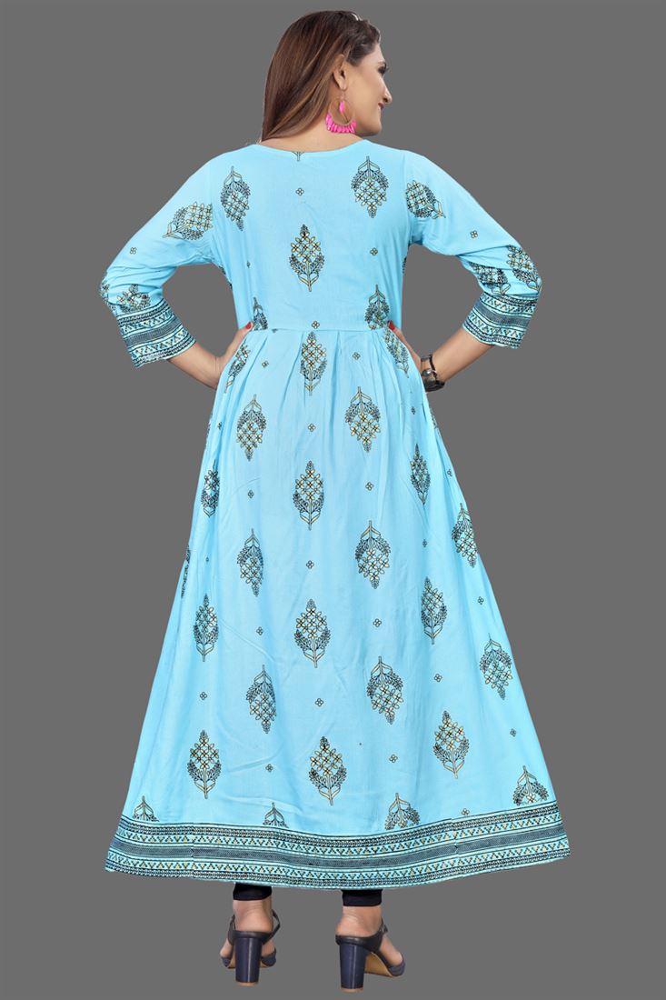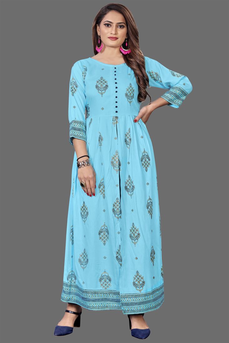 Soothing Rayon Fabric Casual Wear Sky Blue Color Foil Printed Work Readymade Kurti