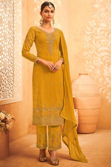 Sparkling Embroidered Work On Georgette Fabric Party Wear Salwar Suit In Yellow Color