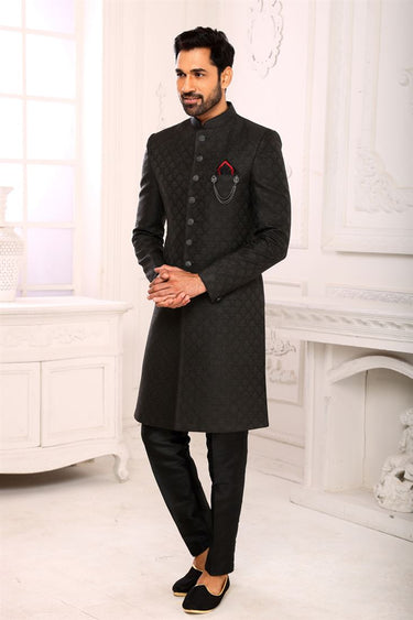 Splendiferous Black Color Brocade Fabric Indo Western For Men