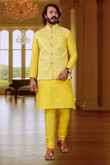 Splendiferous Yellow Color Art Silk Fabric Reception Wear Readymade Kurta Pyjama With Stylish Jacket