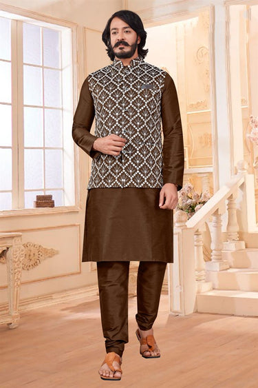 Striking Brown Color Art Silk Fabric Sangeet Wear Readymade Kurta Pyjama With Trendy Jacket