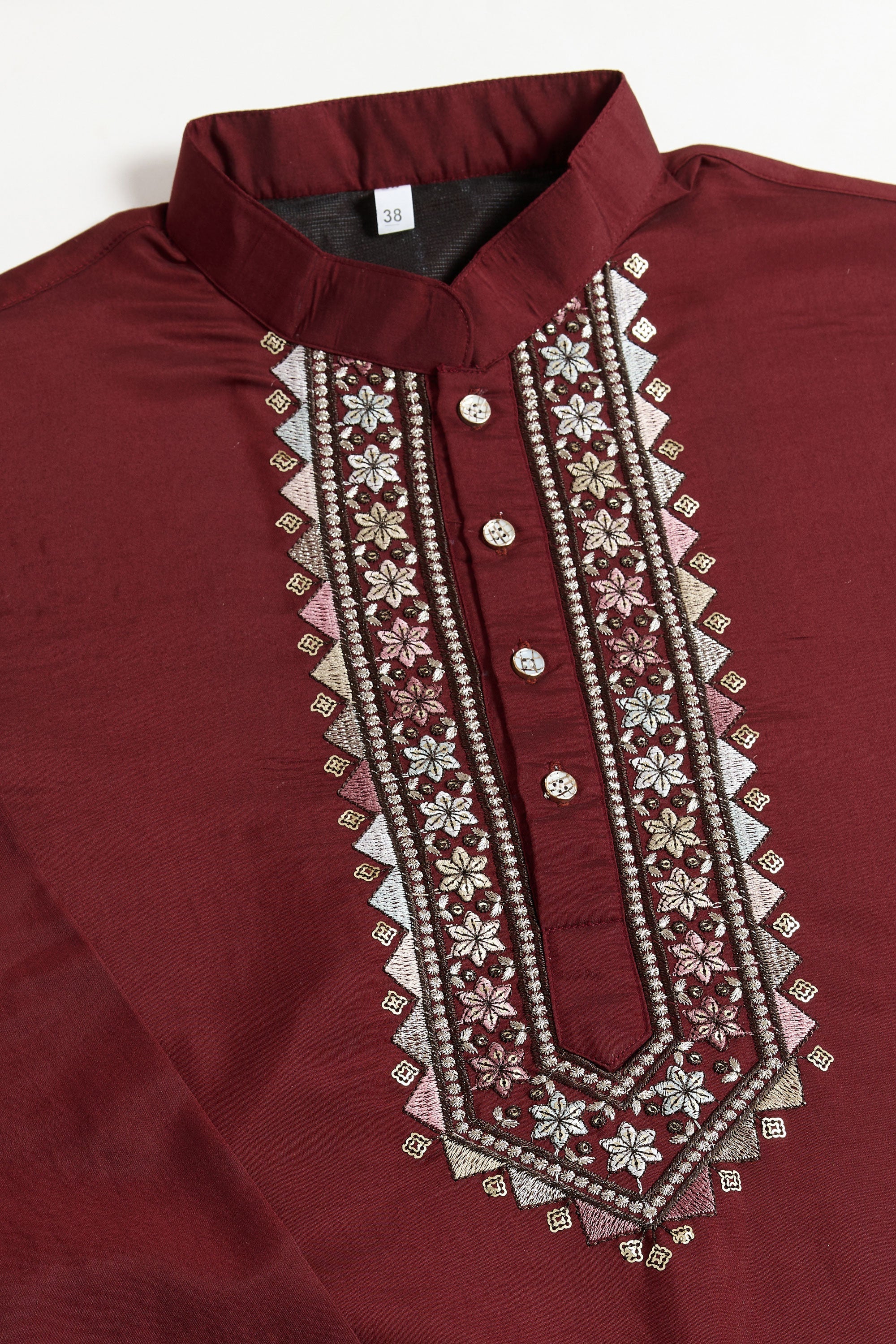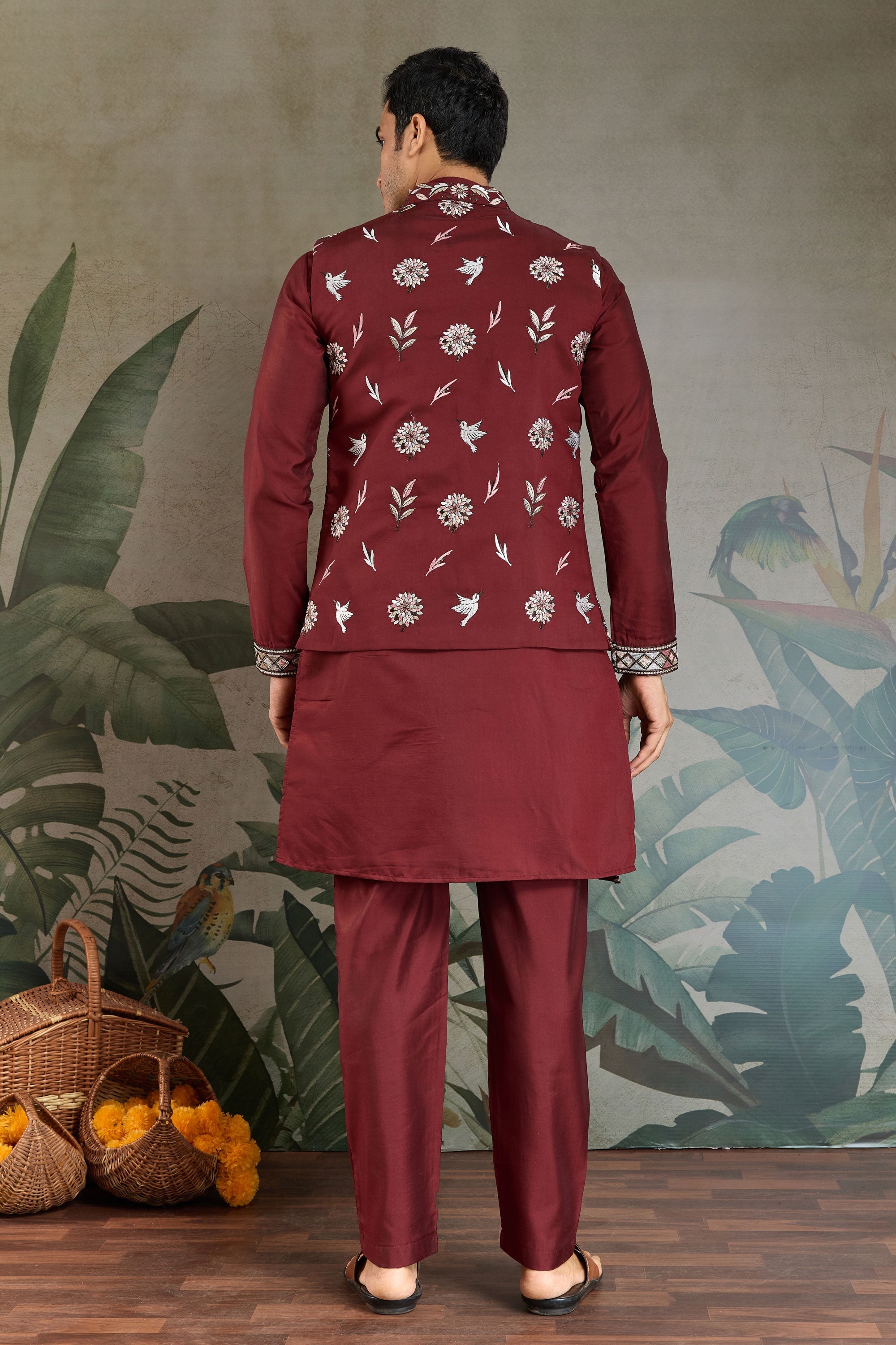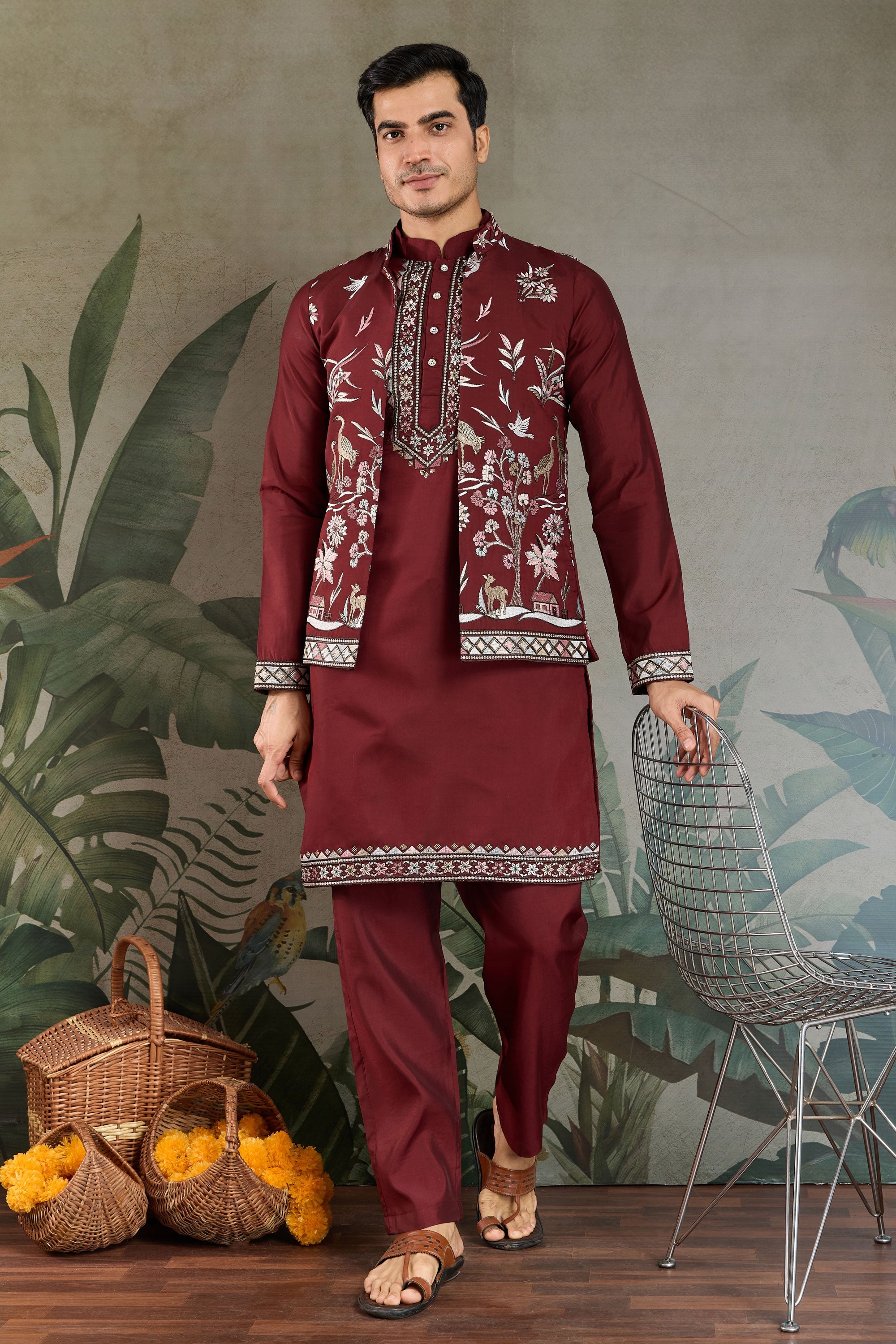 Stunning Maroon Sangeet Wear Readymade Men Kurta Pyjama With Jacket