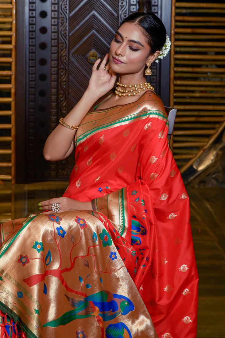 Introducing our exquisite and captivating Red Color Paithani Silk Saree, meticulously crafted to elevate your style and grace.