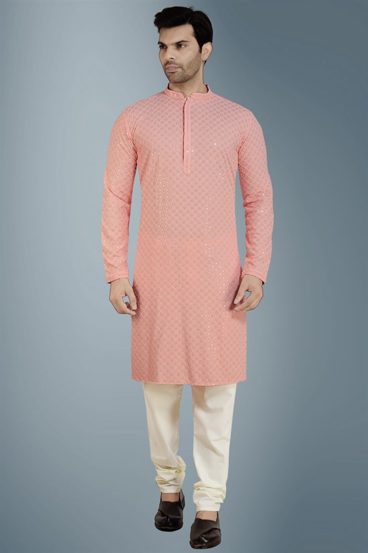 Stunning Pink Color Cotton Fabric Festive Wear Readymade Kurta Pyjama For Men