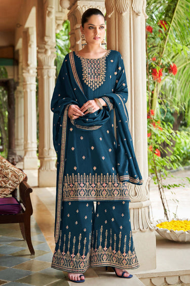 Teal Color Art Silk Fabric Adorming Function Wear Palazzo Suit