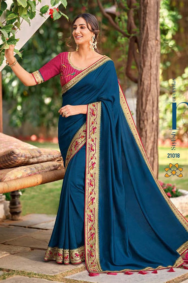 Teal Color Border Work On Art Silk Fabric Festival Wear Riveting Saree