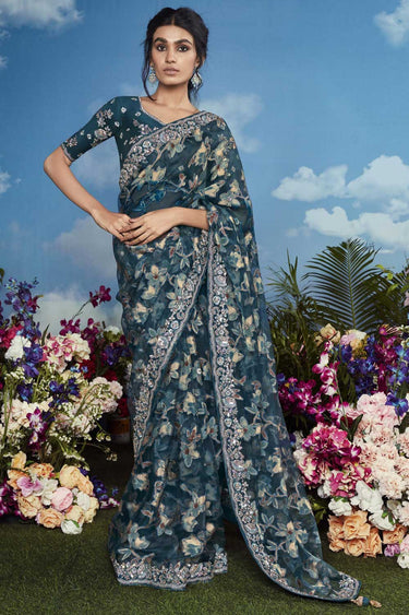 Teal Color Glorious Brasso Fabric Party Style Saree