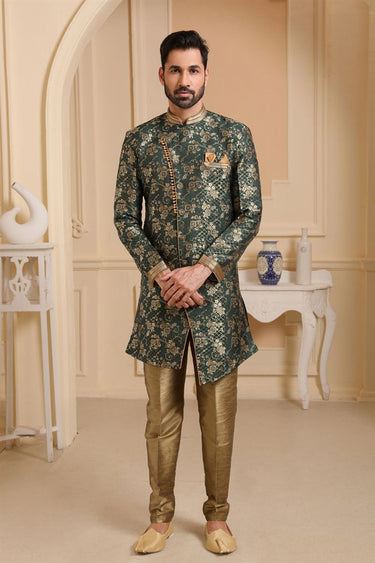 Teal Color Jacquard Silk Reception Wear Readymade Indo Western For Men