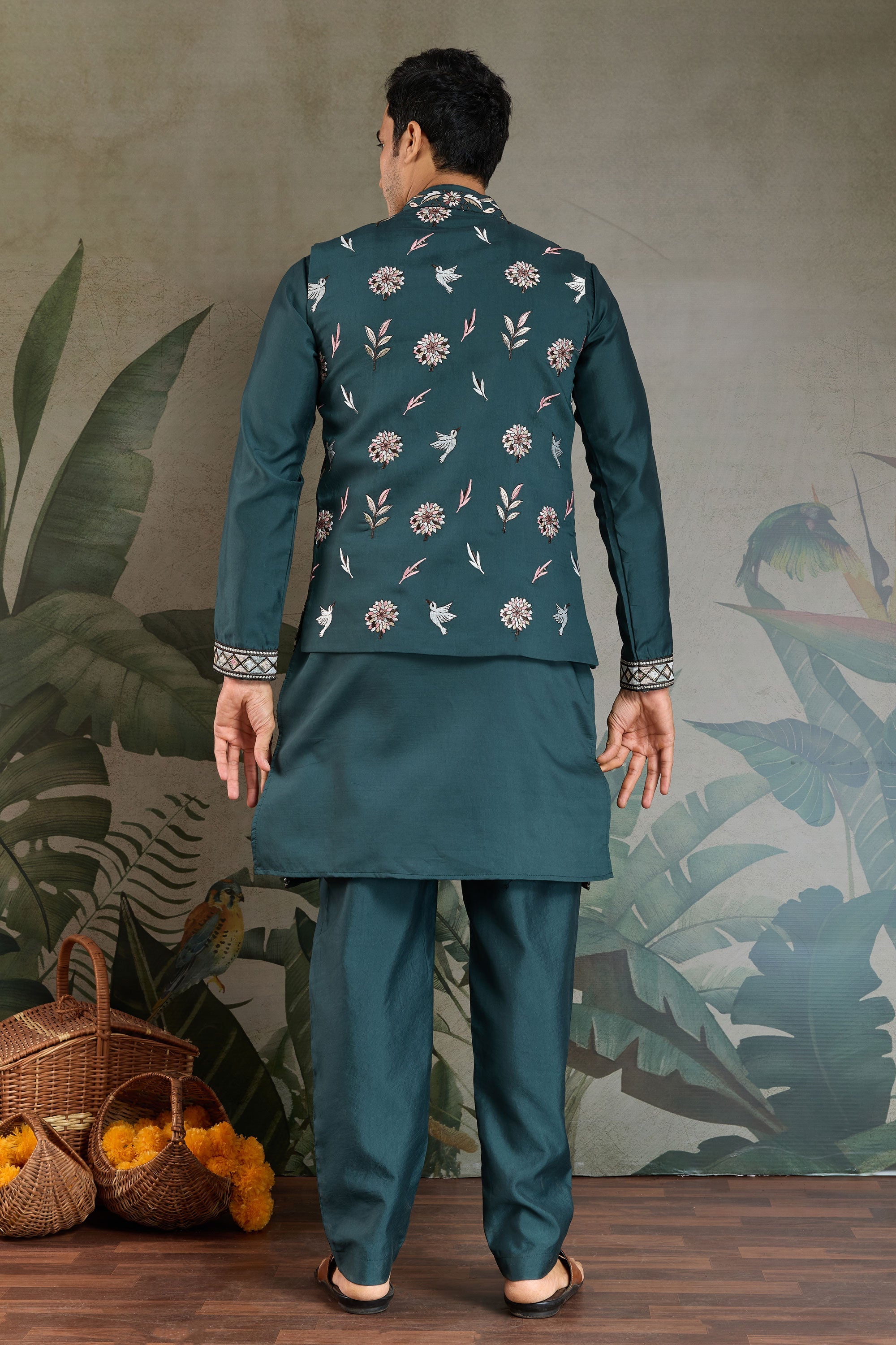 Teal Green Sangeet Wear Readymade Lovely Kurta Pyjama For Men With Jacket