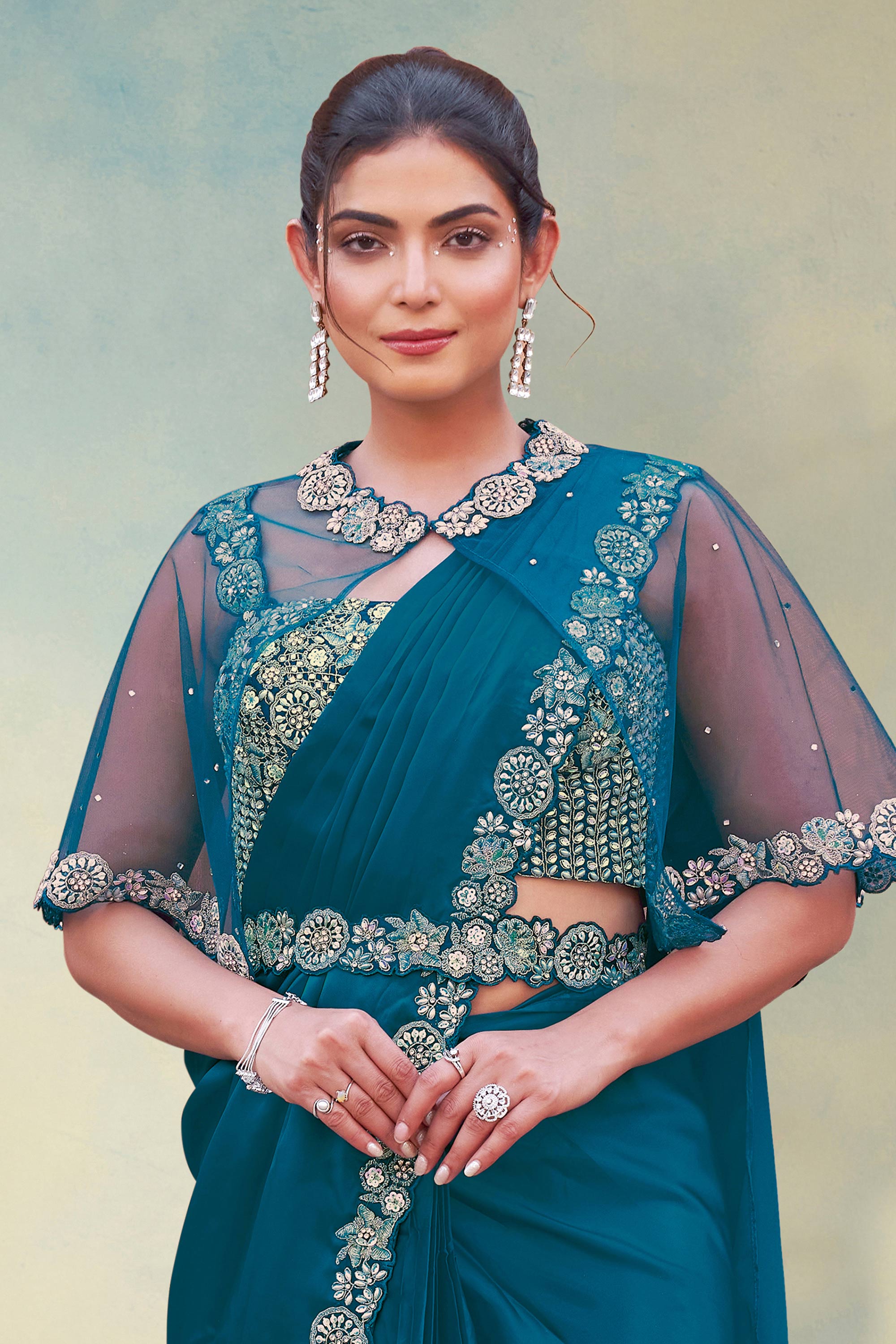 Teal Satin Silk Border Work Readymade Saree For Wedding Wear