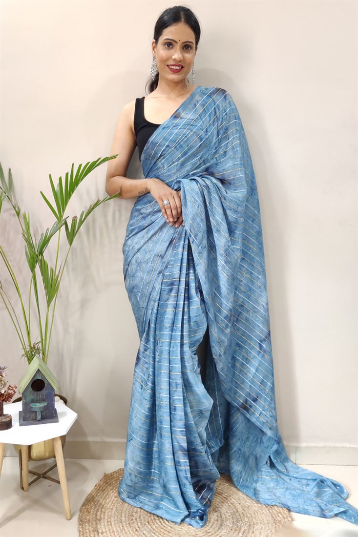 Tempting Dyed Printed Ready To Wear Chiffon Saree In Sky Blue Color