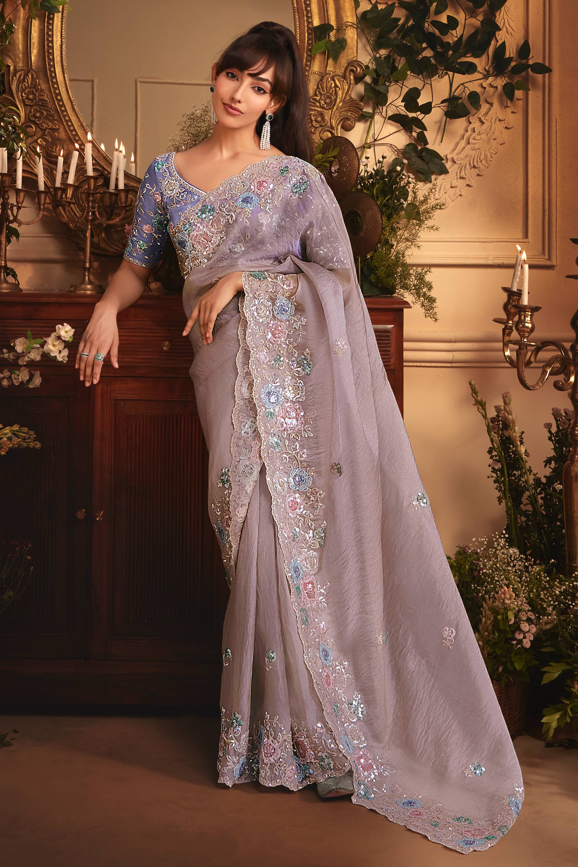 Tempting Organza Fabric Grey Color Saree With Border Work